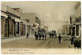 Materias: Transporte rural - Calesas - Carneiro, David - Calle Manuel Antonio Matte (Antofagasta, Chile) - Calle Angamos (Antofagasta, Chile) - Historia - Fotografías - Antofagasta (Chile) - Tarjetas postales - Arquitectura de viviendas