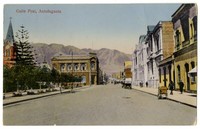 Calle Prat, Antofagasta : [Vista de la torre de la Catedral San José, a su lado el Banco Español, se observa la parte superior del Kiosko de la retreta de la Plaza Colón; en la vereda del frente, el Edificio de la Intendencia de color blanco, entre otros edificios; al fondo, la Cordillera de la Costa] [fotografía] / Lemare & Co. Antofagasta : Lemare & Co. , [entre 1924 y 1930]. 1 tarjeta postal : colotipo, fotomecánico policromo sobre papel ; 13,8 x 8,7 cm. .