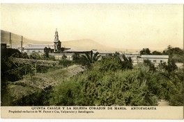 Quinta Casale y la Iglesia Corazón de María, Antofagasta [fotografía] / W. Paton y Cía. Antofagasta : W. Paton y Cía. [Entre 1908 y 1912]. 1 tarjeta postal : colotipo, fotomecánico policromo sobre papel ; 14 x 8 cm. .
