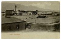 Plaza de Antofagasta; [Frente a la plaza, que cuenta solo con un pequeño espacio de vegetación al centro, circundada por las calles San Martín, Washington, Sucre y Lamar (actualmente Calle Prat), se encuentran la Parroquia San José y otros edificios, alrededor de 1887) [fotografía] / Eggers & Cía. Antofagasta : Eggers & Cía. , [1887]. 1 tarjeta postal : colotipo, fotomecánico monocromo sobre papel ; 14 x 9 cm. .