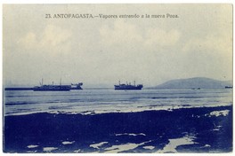 23. Antofagasta-Vapores entrando a la nueva Poza [fotografía] / Fernández y Heras. Antofagasta ; Fernández y Heras , [Entre 1920 y 1925]. 1 tarjeta postal : colotipo, fotomecánico monocromo sobre papel ; 14 x 9 cm. .