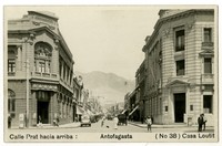 Calle Prat hacia arriba : Antofagasta : [Edificio del Banco Español de Chile y en la Esquina sur este, el edificio del Banco Anglo Sud Americano; Calles Prat y San Martín] [fotografía] Casa Louitit.