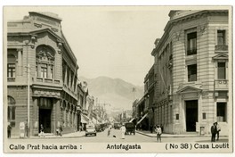 Calle Prat hacia arriba : Antofagasta : [Edificio del Banco Español de Chile y en la Esquina sur este, el edificio del Banco Anglo Sud Americano; Calles Prat y San Martín] [fotografía] / Casa Louitit. Antofagasta : Casa Loutit , [entre 1925 y 1930]. 1 tarjeta postal : fotografía, monocromo, gelatina sobre cartulina ; 13,5 x 8 cm. .