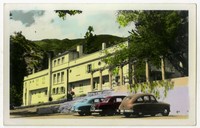 [Hotel Balneario Jahuel y autos de clientes estacionados a un costado] [fotografía] / Hotel Balneario Jahuel, Chile. [San Felipe] : Hotel Balneario Jahuel, Chile , [Entre 1950 y 1960]. 1 tarjeta postal : fotografía, policromo gelatina sobre papel ; 14 x 9 cm. .