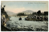 Los Andes - [Cruce] del Rio Aconcagua [Grupo de personas; Canasta de madera suspendida, con cruce de cables para que la gente atraviese] [fotografía] / Juan M. Sepúlveda V. Los Andes : Juan M. Sepúlveda V. , [Entre 1912 y 1920]. 1 tarjeta postal : colotipo, fotomecánico policromo sobre papel ; 13,5 x 8,8 cm. .