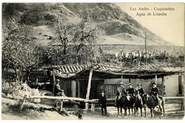 [Los Andes - Coquimbito Agua de Lourdes] : [Vista exterior de una casa rural: grupo familiar, cuatro hombres a caballo uno de ellos, bebe de una copa; Ropa secándose al sol, en un rústico tendedero] [fotografía] / Juan M. Sepúlveda V. Los Andes : Juan M. Sepúlveda V. , [Entre 1915 y 1925]. 1 tarjeta postal : colotipo, fotomecánico monocromo sobre papel ; 13,8 x 9 cm. .