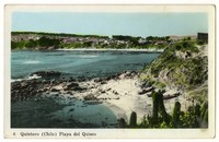 Quintero (Chile) Playa del Quisco [fotografía]. Quintero : [Editor no identificado] , 1960. 1 tarjeta postal : fotografía, policromo gelatina sobre papel ; 13 x 7,7 cm. .
