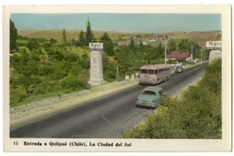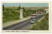 15 Entrada a Quilpué (Chile), la Ciudad del Sol [fotografía]. Quilpué : [Editor no identificado , Entre 1945 y 1955]. 1 tarjeta postal : fotografía, policromo gelatina sobre papel ; 14 x 9 cm. .