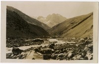 Río Volcán y Cerro Morado. Los Andes (Chile) [fotografía]. Chile : [Editor no identificado , Entre 1930 y 1940]. 1 tarjeta postal : fotografía, monocromo, gelatina sobre papel ; 12,5 x 8 cm. .