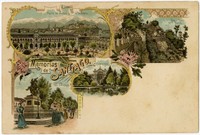 [Collage: "Memorias de Santiago"; Plaza de Armas y la Cordillera, Cerro Santa Lucía, Alameda con O'Higgins y en La Quinta] [fotografía]. Santiago : [Editor no identificado , Entre 1900 y 1910]. 1 tarjeta postal : litografía, monocromo coloreado, gelatina sobre papel ; 13 x 9 cm. .
