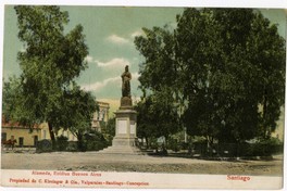 Alameda, Estátua Buenos Aires Santiago [fotografía] / C. Kirsinger & Cía. Santiago : C. Kirsinger & Cía. , [Entre 1901 y 1909]. 1 tarjeta postal : colotipo, fotomecánico policromo sobre papel ; 13,8 x 8,1 cm. .