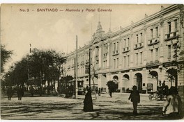 No. 3 - Santiago - Alameda y Portal Edwards : [Gran Peluqueria Universal, Mercería Europea, Muebleria, Casa Matas, etc.; paseantes, tranvía y y carros de sangre] [fotografía] / Gallardo Hnos. Santiago : Gallardo Hnos., [Entre 1911 y 1916]. 1 tarjeta postal : colotipo, fotomecánico monocromo sobre papel ; 14 x 9 cm. .