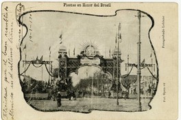 Fiesta en Honor del Brasil : [Arco de homenaje a marinos brasileños; en la marquesina del arco, una placa conmemorativa que dice: "La Ciudad de Santiago a sus (ilegible) ... Los Marinos Brasileros"] [fotografía] / Foto Spencer. Santiago : Foto Spencer , 1904. 1 tarjeta postal : medio tono, fotomecánico monocromo sobre papel ; 14 x 9 cm. .