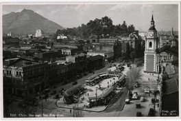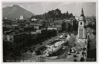 Chile, Santiago San Francisco : [Pérgola de San Francisco o de las Flores y glorieta en el bandejón central; Vereda Sur: Iglesia de San Francisco y la torre de la Iglesia del Carmen Alto, Vereda Norte: Casonas con establecimientos comerciales en la planta baja: entre otros el "Palacio del Abuelito Calzado Fino"; vista parcial de la Biblioteca Nacional (Alameda con calle MacIver); de fondo, el Cerro San Cristóbal] [fotografía] / Fot. Mora. Santiago : Fot. Mora , [Entre 1930 y 1940]. 1 tarjeta postal : fotografía, monocromo, gelatina sobre papel ; 13,5 x 8,5 cm. .
