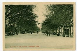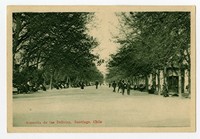 Alameda de las Delicias, Santiago. Chile [fotografía]. Santiago : [Editor no identificado, Entre 1900 y 1910]. 1 tarjeta postal : huecograbado, fotomecánico monocromo sobre papel ; 13,7 x 8,8 cm. .