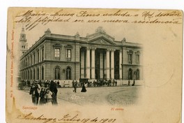 Santiago, El Correo : [Detrás del Edificio de Correos, ubicado en Calle Catedral esq. Puente, a la izquierda, se observa la cúpula del Cuartel General del Cuerpo de Bomberos de Santiago, calle Santo Domingo esq. Puente] [fotografía] / Carlos Brandt. Santiago : s.n.] Iquique : Carlos Brandt , 1903. 1 tarjeta postal : colotipo, fotomecánico monocromo sobre cartulina, 10 x 7 cm. .