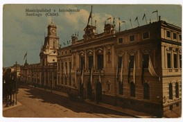 Municipalidad e intendencia Santiago (Chile) : [Palacio del Gobernador (Correo Central), Palacio de la Real Audiencia y Cajas Reales (Museo Histórico Nacional de Chile), y el Cabildo Colonial (Municipalidad de Santiago)] [fotografía] / Hume y Ca. Santiago : Hume y Ca. , [entre 1890 y 1900]. 1 tarjeta postal : colotipo, fotomecánico policromo sobre papel ; 13,8 x 8,8 cm. .