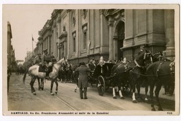 Materias: Historia - Arquitectura religiosa - Fotografías - Chile - Alessandri Palma, Arturo - Ritos y ceremonias - Edificios históricos - Tarjetas postales - Arquitecto - Catedral de Santiago (Chile) - Plaza de Armas (Santiago, Chile) - Carruajes - Santiago (Chile : Ciudad) - Toesca, Joaquín