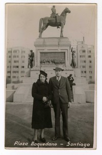 Frente al Monumento al General Manuel Baquedano, posa una pareja; en segundo plano, los edificios Turri.