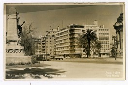 "Estatua a la Gloria", obra realizada en bronce, del escultor chileno Guillermo Córdova, en 1910, obsequio de la Colonia Francesa al Centenario de la Independencia chilena, ubicada frente al Palacio de Bellas Artes en el Parque Forestal; residencias, transeúntes, locomoción colectiva, automóviles, luminarias.