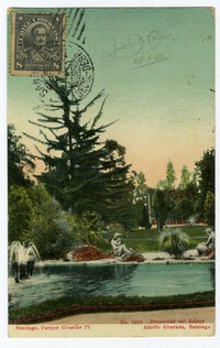 Santiago, Parque Cousiño IV : [fotografía] / Adolfo Conrads. Santiago : Adolfo Conrads , 1915. 1 tarjeta postal : medio tono, fotomecánico policromo sobre papel ; 8,8 x 13,4 cm. .