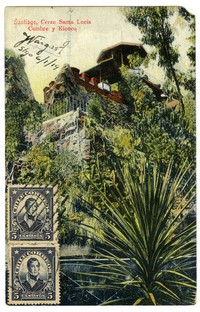 Santiago, Cerro Santa Lucía Cumbre y Kiosco [fotografía] / C. Kirsinger & Cia. Valparaíso : C. Kirsinger & Cia. , 1919. 1 tarjeta postal : colotipo, fotomecánico policromo sobre papel ; 8,8 x 13,8 cm. .