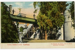 Cerro Santa Lucía, Santiago : Puente de fierro tras la Gran. Entrada Principal. [fotografía]. Santiago : [Editor no identificado] , 1914. 1 tarjeta postal : colotipo, fotomecánico policromo sobre papel ; 13,5 x 7,5 cm. .
