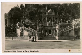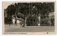 Santiago, (Chile) Entrada al Cerro [fotografía]. Santiago : [Editor no identificado , Entre 1905 y 1915]. 1 tarjeta postal : fotografía, monocromo, gelatina sobre papel ; 13 x 7,8 cm. .