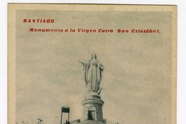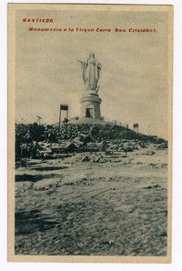 Santiago Monumento a la Virgen Cerro San Cristóbal [fotografía] / Edición Marinetti. Santiago : Edición Marinetti, [1928]. Litografía : monocromo, gelatina sobre papel ; 8,5 x 13,4 cm. .