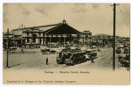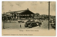 Santiago - Estación Central Alameda [fotografía] / Carlos Kirsinger & Cia. Santiago : C. Kirsinger & Cia. , [entre 1901 y 1909]. 1 tarjeta postal : colotipo, fotomecánico monocromo sobre papel ; 13,7 x 7,5 cm. .