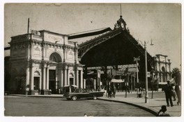 Materias: Edificios y estructuras - Schneider et Cie. (Le Creusot, Francia) - Estación Central (Santiago, Chile) - Empresa de los Ferrocarriles del Estado (Chile) - Automóviles antiguos y clásicos - Tarjetas postales - Edificios históricos - Ferrocarriles - Arquitectura - Fotografías - Santiago (Chile : Ciudad) - Murillo, Eduardo - Moeren, Rolf - ESTACIONES DE FERROCARRIL - Editor - Farmacias - Edificios, estructuras, etc - Historia