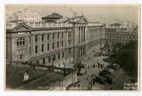 Chile, Santiago .- Palacio de los Tribunales - [fotografía] / Foto. Mora. Santiago : Foto. Mora , Entre 1939 y 1945]. 1 tarjeta postal : colotipo, fotomecánico monocromo sobre papel ; 13 x 8 cm. .