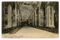 Interior de la Catedral. Santiago [fotografía] / J. Allan. Santiago : J. Allan , 1911. 1 tarjeta postal : colotipo, monocromo coloreado, gelatina sobre papel ; 13,8 x 8,9 cm. .