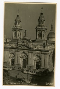 Materias: Historia - Arquitectura religiosa - Fotografías - Iglesia Católica - Transporte urbano - Edificios históricos - Tarjetas postales - Arquitecto - Catedral de Santiago (Chile) - Plaza de Armas (Santiago, Chile) - Catedrales - Santiago (Chile : Ciudad) - Toesca, Joaquín - Renner, Guillaume