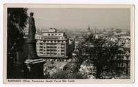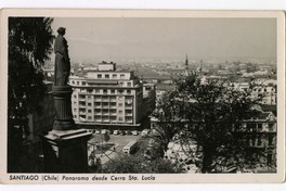 Santiago (Chile) Panorama desde Cerro Sta. Lucía [fotografía]. Santiago : [Editor no identificado , Entre 1950 y 1959]. 1 tarjeta postal : fotografía, monocromo, gelatina sobre papel ; 13 x 7,8 cm. .