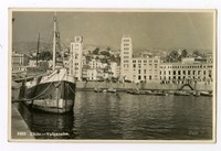 Chile. - Valparaíso : [Puerto de Valparaiso: entre otros edificios; las dos torres que conforman la Estación y la Superintendencia de Aduanas y el restaurant "La Nave"] [fotografía] / Fot. Mora. Valparaíso : Fot. Mora , [entre 1950 y 1960]. 1 tarjeta postal : fotografía, monocromo, gelatina sobre papel ; 13,3 8,5 cm. .