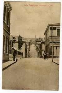 Calle Templeman, Valparaiso, Chile [fotografía] / J. Allan. Valparaíso : J. Allan , [Entre 1910 y 1919]. 1 tarjeta postal : colotipo, fotomecánico monocromo sobre papel ; 8,8 x 13,6 cm. .