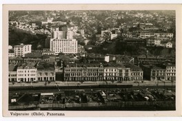 Valparaiso (Chile), Panorama [fotografía]. Valparaíso : [Editor no identificado , Entre 1939 y 1945]. 1 tarjeta postal : fotografía, monocromo, gelatina sobre papel ; 14 x 9 cm. .