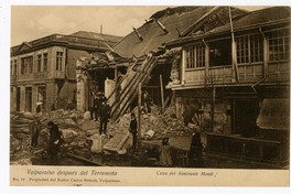 Valparaíso despues del Terremoto : Casa del Almirante Montt Carlos Brandt. Valparaíso : Carlos Brandt , 1906. 1 tarjeta postal : colotipo, fotomecánico monocromo sobre papel ; 14 x 8 cm. .
