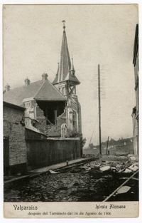 Valparaíso Iglesia Alemana despues del Terremoto del 16 de agosto de 1906 C. Kirsinger & Cia. Valparaíso : C. Kirsinger & Cia. , [1906]. 1 tarjeta postal : colotipo, fotomecánico monocromo sobre papel ; 8,7 x 12,7 cm. .