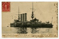 Nota manuscrita en el tiro:" Valp. 5.3.04. Esta mañana nadé bien cerca hasta el O'Higgins con una amiga. le mando esta tarjeta porque me parece que Ud es gran patriota. Saludos. M. Teresa Costa."; dirigida al Señor Daltro Santos.