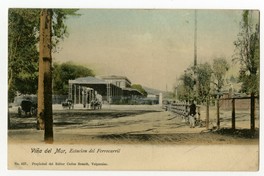 Viña del Mar, Estacion del Ferrocarril [fotografía] / Carlos Brandt. Valparaíso : Carlos Brandt , [Entre 1895 y 1905]. 1 tarjeta postal : colotipo, fotomecánico policromo sobre papel ; 14 x 9 cm. .