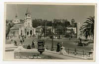 Chile.- Viña del Mar : [Plaza Sucre y la Parroquia "Nuestra Señora de los Dolores", conocida como "Parroquia Viña del Mar"] [fotografía] / Foto Mora. Valparaíso : Foto Mora , Entre 1935 y 1945]. 1 tarjeta postal : fotografía, monocromo, gelatina sobre papel fibra ; 13,2 x 8,2 cm. .