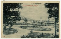San Antonio.- Plaza [fotografía] / Edición Marinetti. Santiago : Edición Marinetti , [1928]. 1 tarjeta postal : colotipo, fotomecánico monocromo sobre papel fibra ; 14 x 9 cm. .