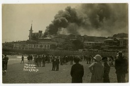 Incendio Playa Chica [fotografía] / Foto Armijo. Chile : Foto Armijo , 1930. 1 tarjeta postal : fotografía, monocromo, gelatina sobre papel fibra ; 13,7 x 8,7 cm. .