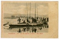 Constitución - En viaje de regreso á Talca - Rio Maule [fotografía] / Libreria Nacional de Enrique Prieto, Talca : Libreria Nacional de Enrique Prieto , [entre 1904 y 1912]. 1 tarjeta postal : colotipo, fotomecánico monocromo sobre papel fibra ; 14 x 9 cm. .