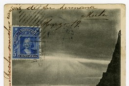 Dedicatoria manuscrita en el tiro: "Mi linda: Mucho te hemos recordado en tu dia i esperamos que lo hayas pasado mui feliz i que para este otro año te podamos celebrar en regla. Reciba muchos cariños de tu hermana Meche . Marzo 19"; dirigida a la Señora Amanda Rojas de Yrarrázaval, Victoriastrasse 24 Halle a/S Alemania. Via Cordillera.