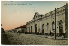 Calle de Maipù y Recoba. Linares. Chile [fotografía] / Juan M. Sepúlveda V. Santiago : Juan M. Sepúlveda V. , [Entre 1912 y 1922]. 1 tarjeta postal : colotipo, fotomecánico policromo sobre papel fibra ; 14 x 9 cm. .