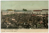 Feria del Mercado. Chillan [fotografía] / J. Allan. Valparaíso : J. Allan , [Entre 1910 y 1919]. 1 tarjeta postal : colotipo, fotomecánico policromo sobre papel fibra ; 14 x 9 cm. .