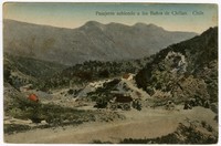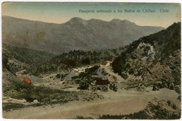 Pasajeros subiendo a los Baños de Chillan. Chile [fotografía] / Juan M. Sepúlveda V. Santiago : Juan M. Sepúlveda V. , [entre 1912 y 1919]. 1 tarjeta postal : colotipo, fotomecánico policromo sobre papel fibra ; 14 x 9 cm .